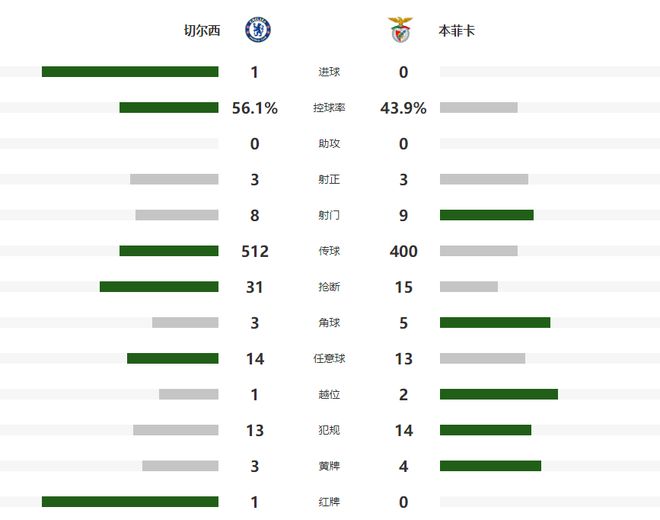 易边再战,加纳乔在第59分钟长途奔袭,但是临门一脚缺乏准度,一脚将皮球踢飞,没有给本菲卡的球门造成实质性的威胁,第73分钟内托禁区内头球攻门稍稍高出,6分钟之后,埃斯特旺接到恩佐传中后,也完成了一记头球,不过被客队门将扑出。